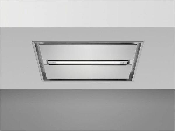 Attraktive, platzsparende Abzugshaube, die an der Decke über der Kücheninsel angebracht wird.
