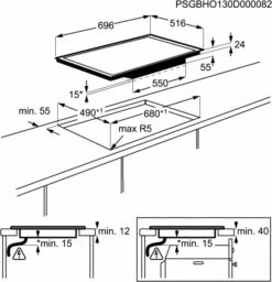 Das Gerät wird mit Sensortasten bedient. Das Induktionskochfeld misst 69,6 cm x 51,6 cm x 5,5 cm und wiegt 12,26 kg.