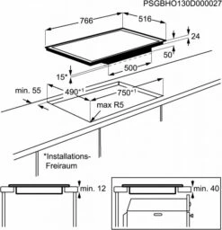 Das Gerät wird mit Sensortasten bedient. Das Induktionskochfeld misst 76,6 cm x 51,6 cm x 5 cm und wiegt 12,78 kg.