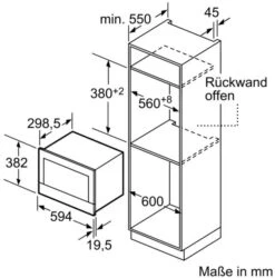 Eine Größe von 59,4 cm x 31,8 cm x 38,2 cm sowie 19 kg Gewicht werden für das Mikrowellengerät angegeben. Das Gerät hat den Türanschlag auf der rechten Seite. Das TFT-Display stellt den Betriebszustand übersichtlich dar.