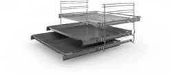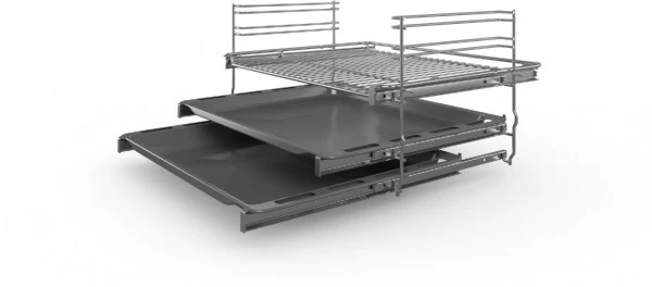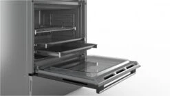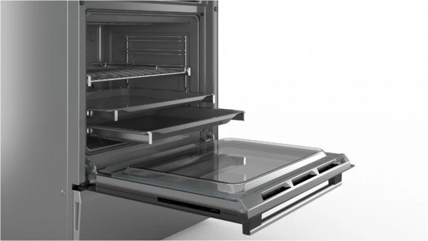 Mit dem Teleskopauszug ziehen Sie den Rost und das Blech komfortabel auf einer Schiene heraus. Für mehr Sicherheit im Alltag sorgt zudem die kühle Backofentür. Brand- oder Verbrennungsgefahren werden dadurch minimiert. Aufwendiges Schrubben nach dem Essen? Nicht bei diesem Ofen, denn dank der pyrolytischen Selbstreinigungsfunktion wird er fast von allein sauber. Über die versenkbaren Schalter bedienen Sie Stand-Herd mit Glaskeramik-Kochfeld komfortabel. Zeitfunktionen wie die Startzeitvorwahl sind von Vorteil, wenn bereits alles vorbereitet ist, das Gericht jedoch erst zu einem späteren Zeitpunkt erhitzt werden soll. 0,77 kWh bei Heißluft/Umluft sowie 0,93 kWh bei Ober-/Unterhitze verbraucht der HKS79U250 und zählt zur Energieeffizienzklasse A. Der Elektroherd hat ein Gewicht von 60,1 kg und ist 60 cm breit, 85 cm hoch und 60 cm tief. Der Lieferumfang des HKS79U250 enthält 1 Backblech, 1 Grillrost und 1 Universalpfanne.