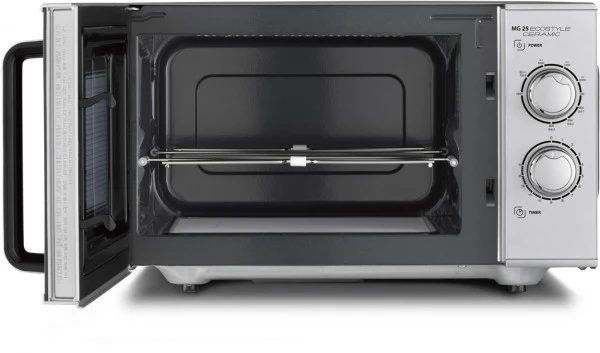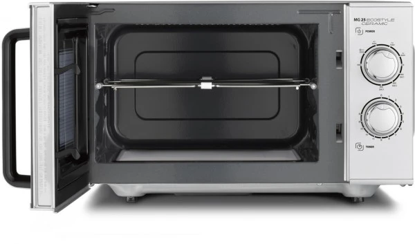 Das Mikrowellengerät hat ein Gewicht von 13,9 kg und ist 49 cm breit, 28,5 cm hoch und 41 cm tief. Links befindet sich der Türanschlag des Geräts. Der Lieferumfang des MG 25 Ecostyle Ceramic enthält 1 Rost.