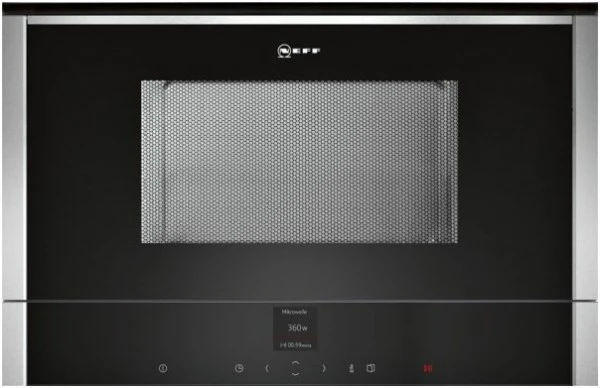 Das Mikrowellengerät hat ein Gewicht von 19 kg und ist 59,4 cm breit, 38,2 cm hoch und 32 cm tief. Das Gerät hat den Türanschlag auf der linken Seite. Das TFT-Display stellt den Betriebszustand übersichtlich dar. Weil das Timing beim Kochen von großer Bedeutung ist, hat NEFF die Elektronik-Uhr vorgesehen.