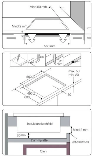 Das Gerät wird mit Sensortasten bedient. Das Induktionskochfeld hat ein Gewicht von 10,5 kg und ist 59 cm breit, 5,7 cm hoch und 52 cm tief.