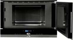 Eine Größe von 59,4 cm x 31,8 cm x 38,2 cm sowie 16 kg Gewicht werden für das Mikrowellengerät angegeben. Das Gerät hat den Türanschlag auf der rechten Seite. Auf dem TFT-Display sehen Sie alle wichtigen Informationen.